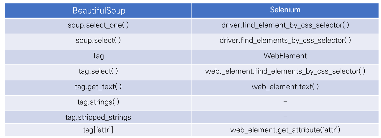 위 표에서 HTML 태그를 BeautifulSoup은 Tag, Selenium은 WebElement라고 부릅니다. BeautifulSoup은 HTML을 파싱 해서 HTML 태그의 내용을 보지만 Selenium은 HTML 태그에 해당하는 웹 요소와 상호 작용하기 때문에 웹 요소라고 부릅니다.